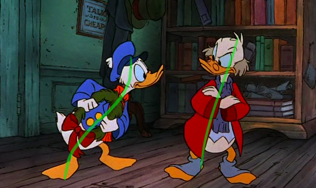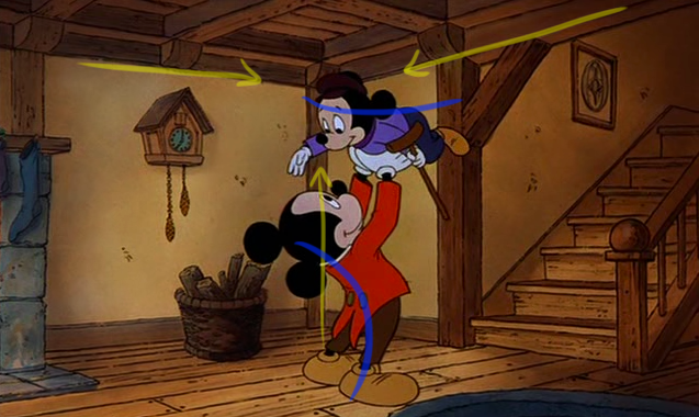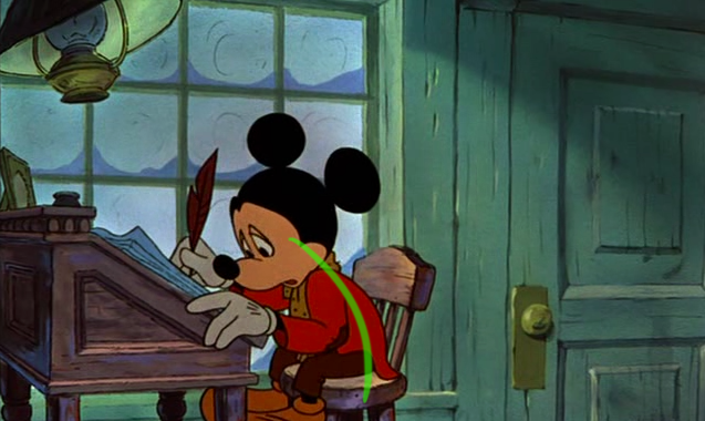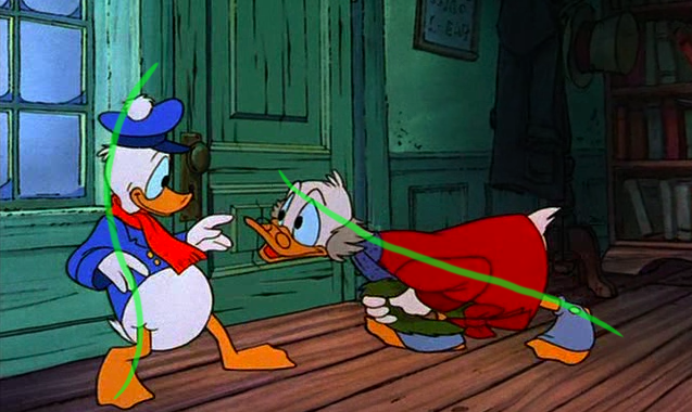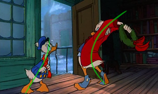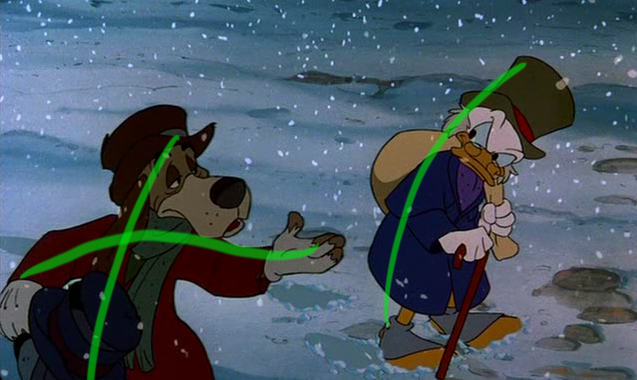 So when I watched Mickey's Christmas Carol on television last Christmas, I knew I had to take a few screen captures from this classic. As shown here in these 150 I've put on display, these poses help illustrate the power of this imaginary line extending through the main action of the figure. You can clearly see how the body bends and forms their emotions, for the purposes of effective body language and visual storytelling techniques. The characters' moods, behaviors, intentions and acting are all enhanced from these strong lines of action.