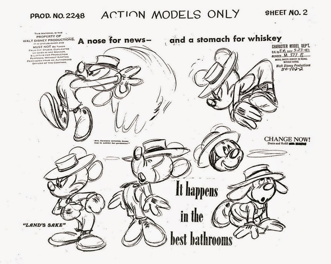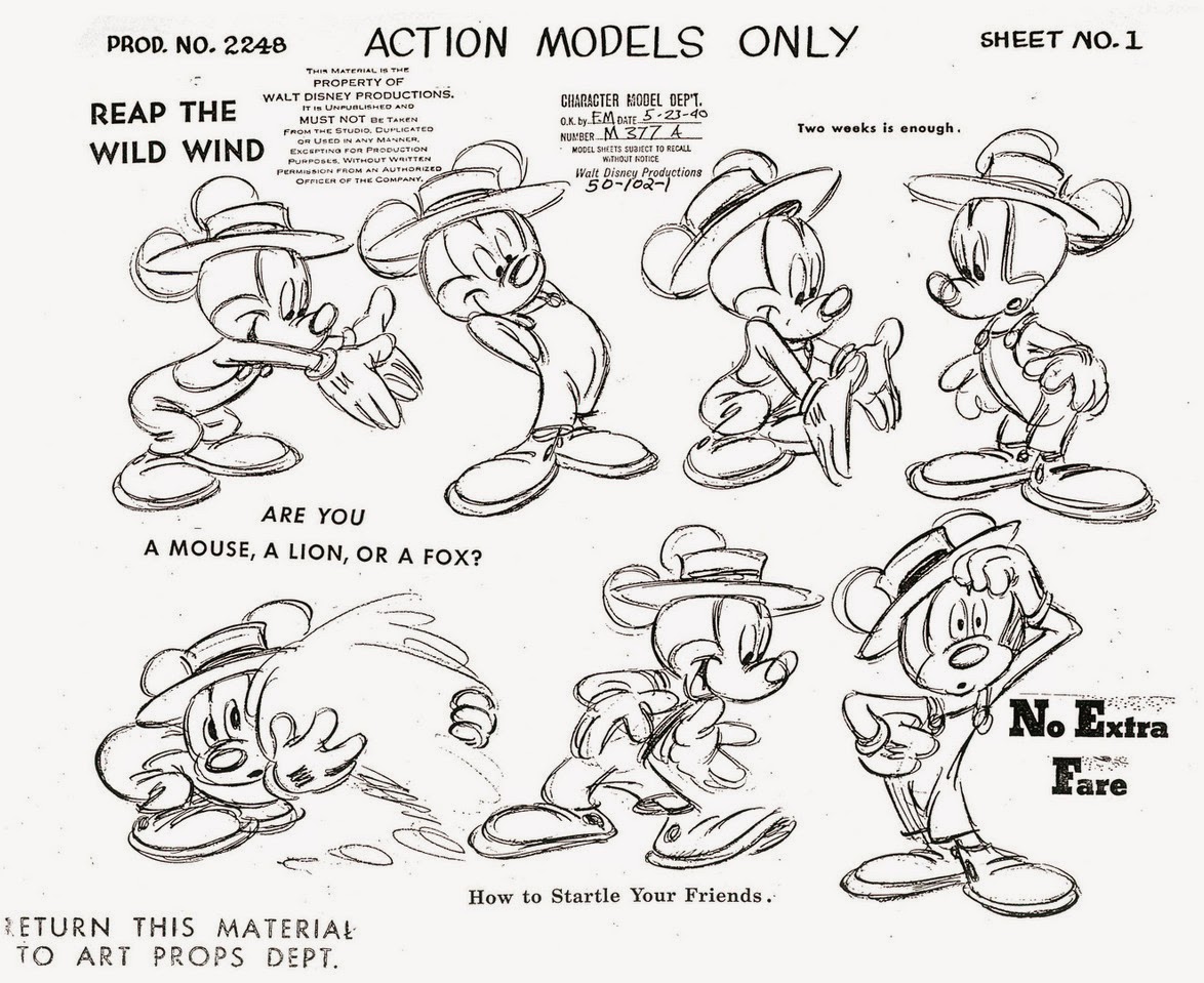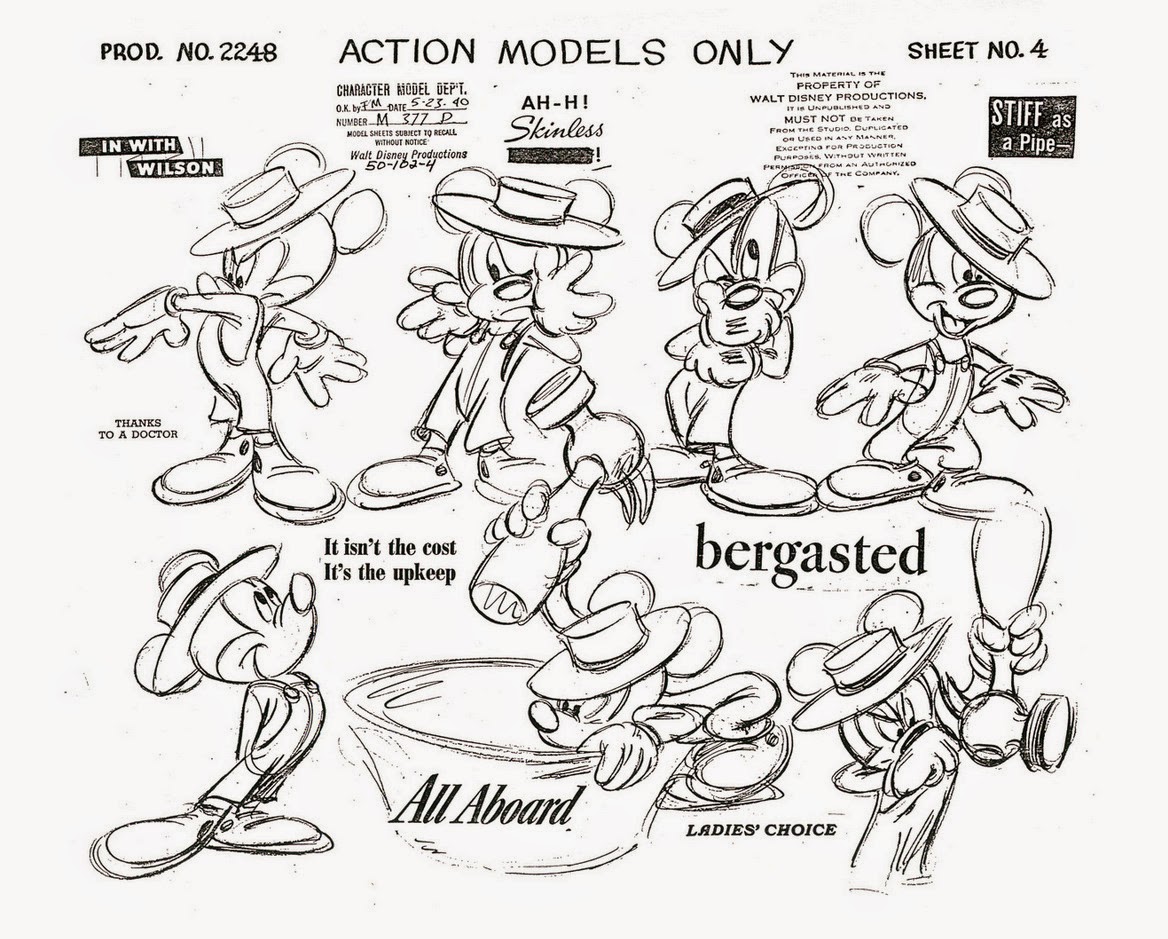 Look at these sample model sheets from another Mickey short, meant to be used as reference since they are action poses or "extreme" poses, but the line of action is still present. There's a clear sense of weight and force in the poses, and the negative space around the pose creates a clean silhouette.