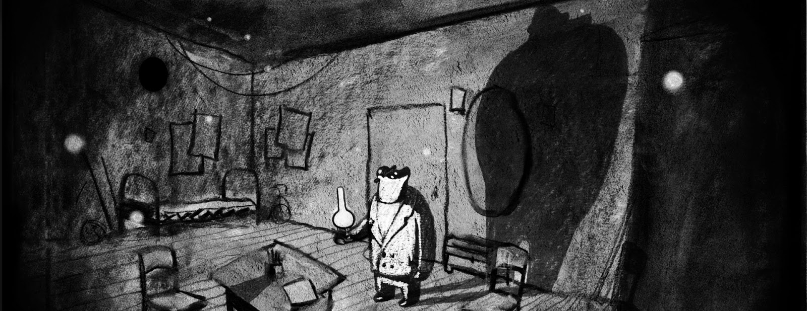 The film is made with charcoal-on-paper technique, drawn entirely by hand. The drawing varies greatly through the film – from sharp lines to criss-cross patterns to fuzzy clouds of charcoal powder mixed with saw dust, depicting diverse environments – the circus, the forest, the meadow, fog and night – with skill and delicacy, as well as showcasing the possibilities of the seemingly limited black-and-white technique.