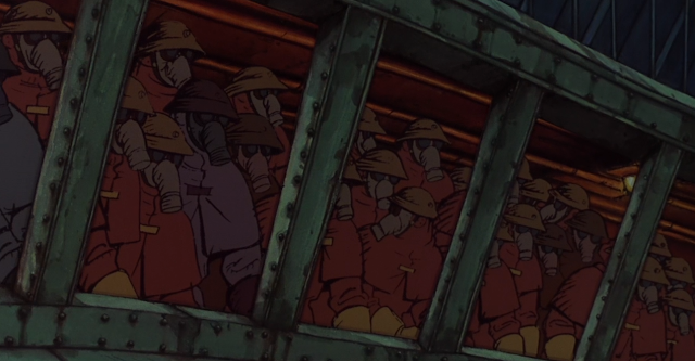 "Memories" is a film comprised of three episodes, the last instalment of these episodes is "Cannon Fodder". It was released in 1995. Katsuhiro Otomo directed Cannon Fodder, it presents the viewer with a grim, ugly dystopia. Filled with vast, fabulous, and ornate structures dominated by countless artillery turrets. The town if filled with with haggard, cadaverous citizens who are, it would seem, absolutely accepting of their sad existence as workers to this greater cause of continually firing cannons at the opposing city far away.