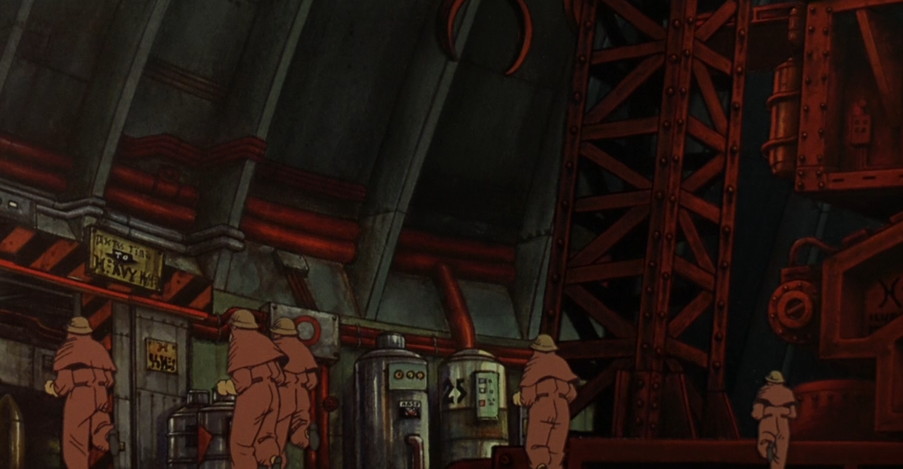 The cyclopean towers of the city are truly awe inspiring, as are the cavernous interiors of the domed turrets in which the impossibly large cannons are kept. The animation is stunning, raw, dirty, textures, greasy and rough. All these elements are rendered in such exquisite and rich detail that the viewer is likely to be enthralled by the strange majesty of the story's town. The city's inhabitants are drawn in an equally accomplished but much sketchier style to have them pop out of their environment and to add to the grittiness of the whole film.